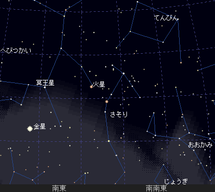 今の季節、さそり座は明け方日の出前にしか見えません。