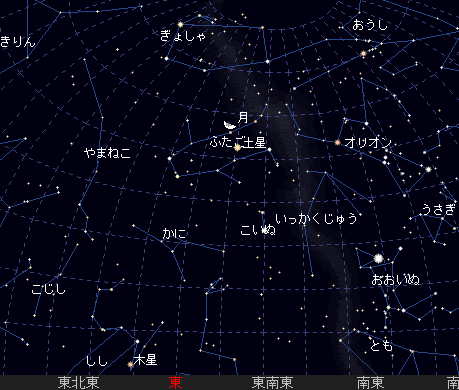19日(金)の夜12時頃、月と土星が東から昇ってきます。