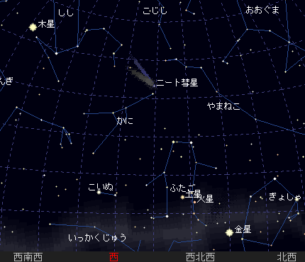 日没後の南西の空に見え、21時頃しずみます。金星のすぐ上です。