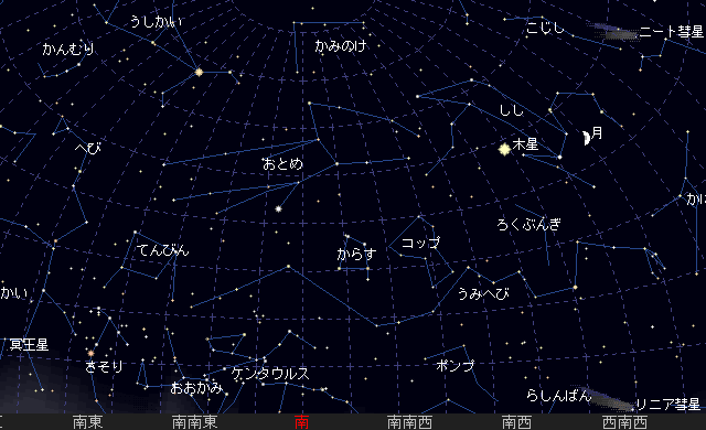 日没後の西の空に見え、21時頃しずみます。土星のすぐ下です。