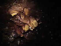 「あった!」近藤君が水晶を見つけました。暗くてわからないので、あやしいものは片っ端からざるに入れて外へ持ち出します。