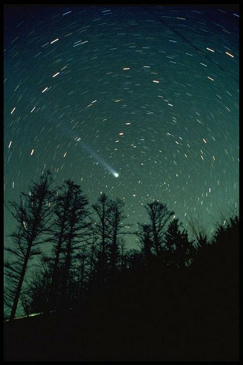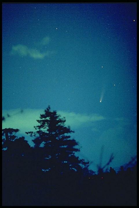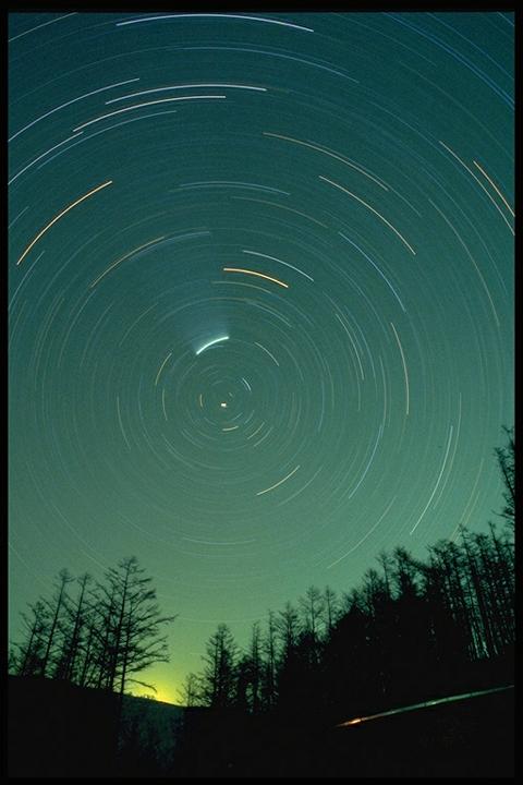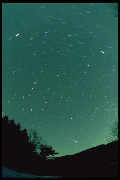 林の上に彗星がたなびく。20mmレンズで撮影。 |